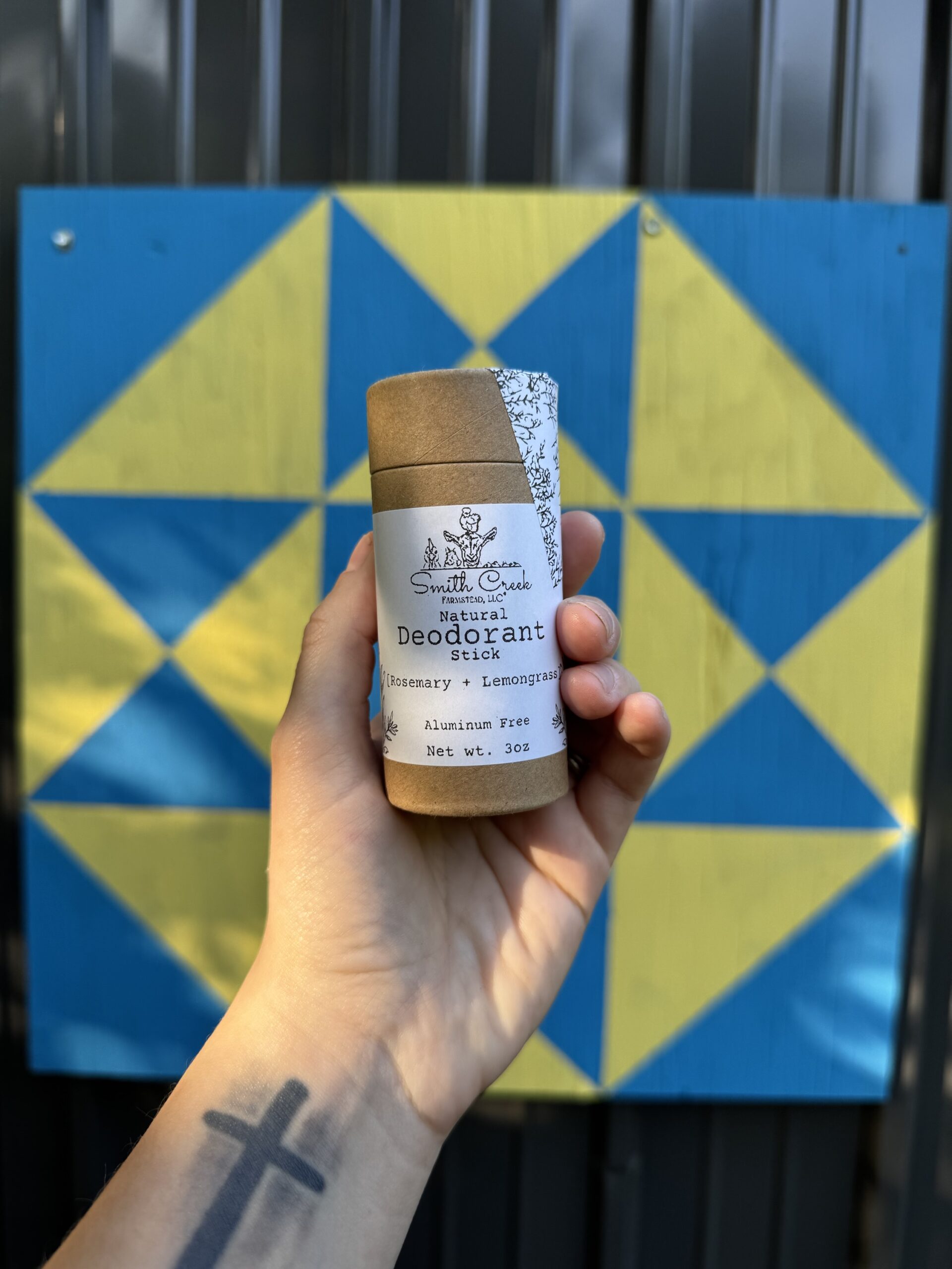 Coconut oil, Arrowroot powder, Bentonite clay, Baking soda, Beeswax, essential oil blend